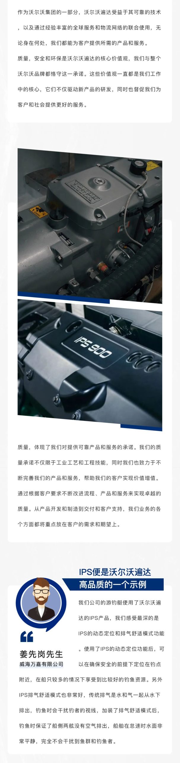 我國是海洋、航海大國,與航海相關的事業(yè)群,如航運、港口、漁業(yè)、造船、海洋石油開發(fā)等產(chǎn)業(yè)在我國國民經(jīng)濟和社會發(fā)展中占據(jù)十分重要的地位。沃爾沃遍達作為海洋動力解決方案的提供方,始終以優(yōu)質的發(fā)動機產(chǎn)品及配套系統(tǒng)和不斷革新的技術,助力航海相關行業(yè)的發(fā)展,保護海洋的原始生態(tài)環(huán)境。